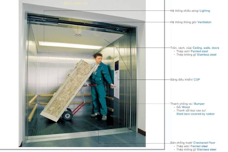 - Tiêu chí của thang máy chở hàng quan trọng nhất là chống va đập tốt, đảm bảo được khả năng chịu lực cao